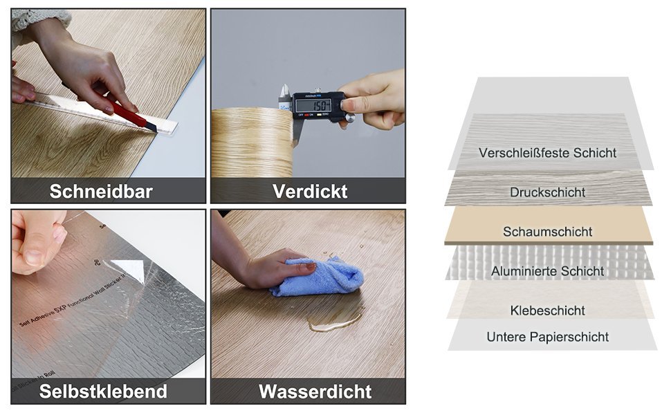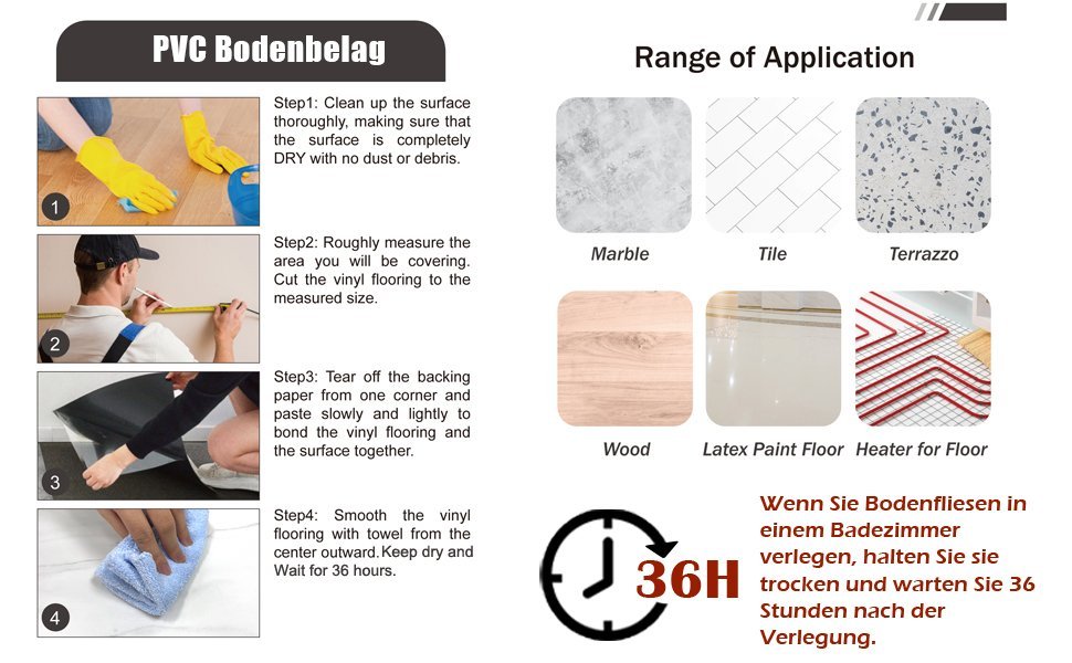 Thickened floor sticker The thickness is more than ordinary self-adhesive PVC floor stickers, with a thickness of 1.5 mm. The foot can feel comfortable on it, and play the role of floor insulation.